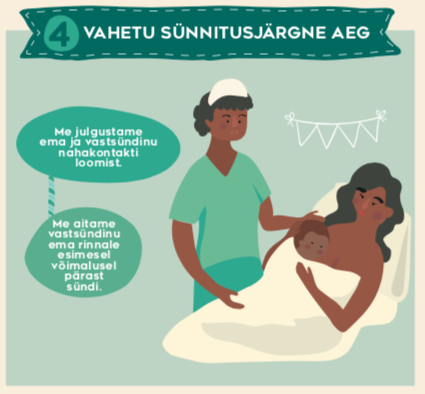 4. Soodustage vahetu ja katkematu nahk naha kontaktiga alustamist ja toetage emasid rinnaga toitmisega alustamisel nii kiiresti pärast lapse sündi kui võimalik.